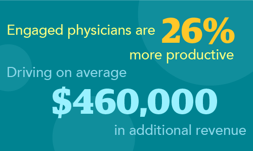 An engaged physician is 26% more productive, driving, on average, an extra $460,000 annually in patient revenue per physician. Add the cost of filling a vacancy vs. the unmeasured benefit of referrals, and an engaged physician has a major impact on the productivity and profitability of your business.