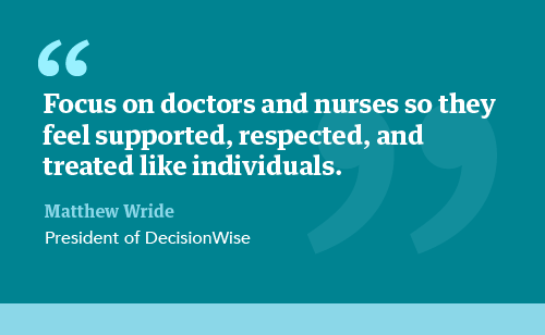 Every organization has some areas that simply function better than others. When it comes to clinician engagement, look for the positive deviants, where things are going well. “Study your strengths, not your weaknesses,” says Matthew Wride, president of DecisionWise, an employee experience firm. “Find out why a particular hospital is off the charts with its engagement scores and spend time there; you’ll find the insights you need.” Then work to replicate those conditions throughout your organization.