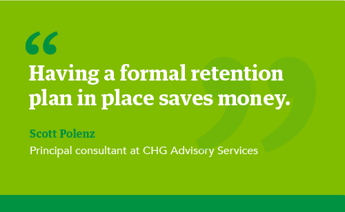 “Having a formal retention plan in place saves money,” says Polenz. “It’s foundational to the health of an organization.”